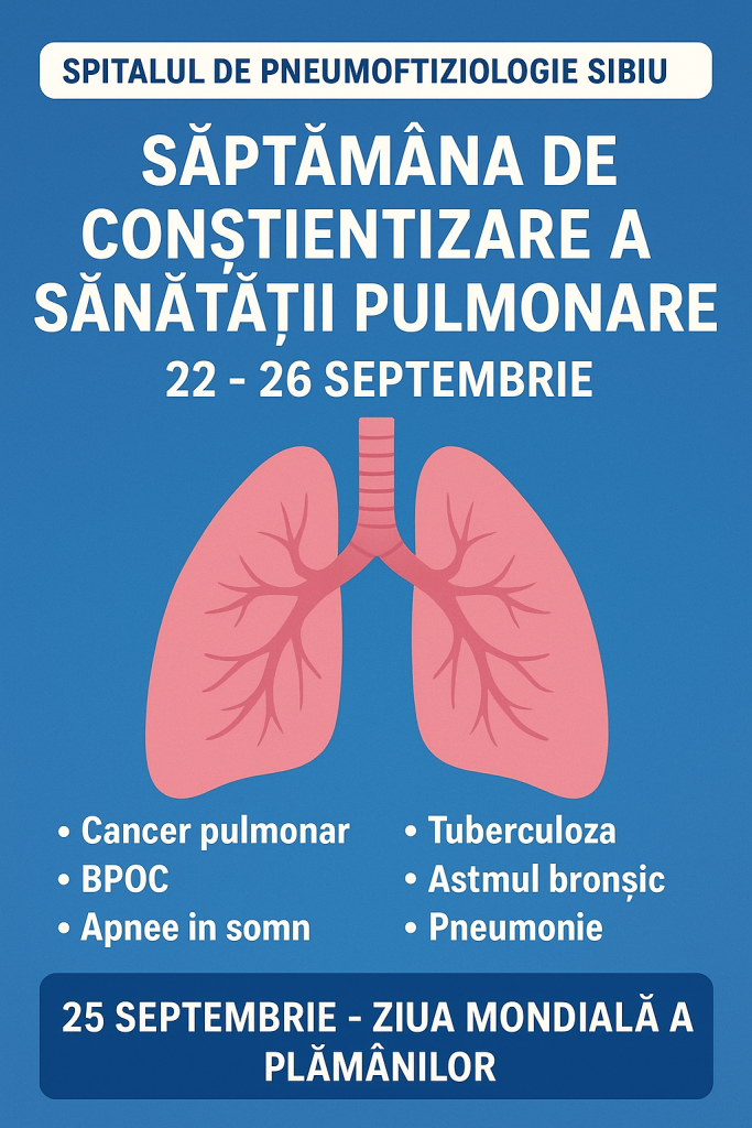Cu ocazia Zilei Mondiale a Plămânilor, celebrată anual la data de 25 septembrie, Spitalul de Pneumoftiziologie Sibiu organizează în perioada 22 – 26 septembrie „Săptămâna de conștientizare a sănătății pulmonare”. Evenimentul are ca scop informarea și educarea publicului cu privire la importanța sănătății respiratorii și prevenirea bolilor pulmonare.